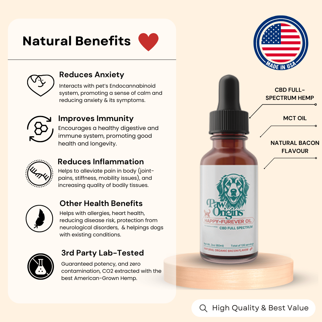 "I have four rescue dogs, and when one starts barking and going into an anxious fit, the rest of them joins in! It's chaos and havoc in my life. My vet was initially hesitant of anxiety medication because of the 'rebound' effect - a side-effect that results in dogs feeling even MORE anxious after the drug wears off. Thankfully, he recommended me to try Happy-Furever. I drop these oils as part of my dog's meals, and our evenings are so much more peaceful these days. They take restful naps, and they wake up excited with a bounce in their step, ready to go for their evening walks. Even my mailman was surprised that my pups were no longer barking at him! I love this formulation, and I strongly believe every dog could benefit from the use of CBD Happy-Furever to help with recovery and promoting a sense of calm."