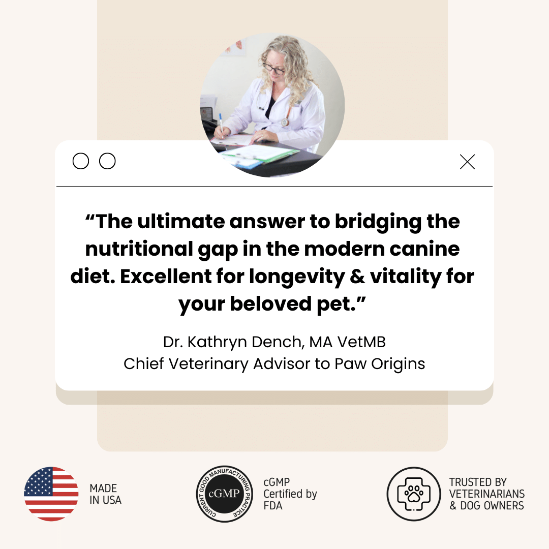 The statements made regarding these products have not been evaluated by the Food and Drug Administration. The efficacy of these products has not been confirmed by FDA-approved research. These products are not intended to diagnose, treat, cure or prevent any disease. All information presented here is not meant as a substitute for or alternative to information from health care practitioners. Please consult your health care professional about potential interactions or other possible complications before using any product. The Federal Food, Drug, and Cosmetic Act require this notice. This is an advertisement for PawOrigins® and is intended for informational purposes only. All information provided by PawOrigins® does not constitute medical advice and should not be used as a replacement for veterinarian advice. The stories shared on this page are drawn from the real-life experiences and insights of actual individuals, including a veterinarian who has generously contributed their expertise. Our intent is to deliver meaningful and pertinent content to our audience. However, every dog is unique and the results portrayed in this story and the comments may not be the results that you or your dog achieve with these products. Results may vary.