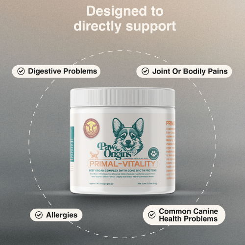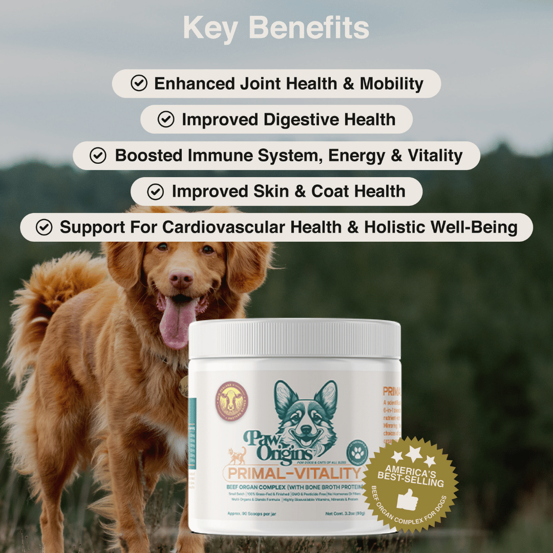 Primal-Vitality™ is a meticulously crafted, hydrolyzed, 6-in-1 blend of vital beef organs including undefatted liver, heart, kidney, pancreas, and spleen. Topped off with nutrient-rich bone broth protein. Mirroring the instinctive dietary choices of canine ancestors.