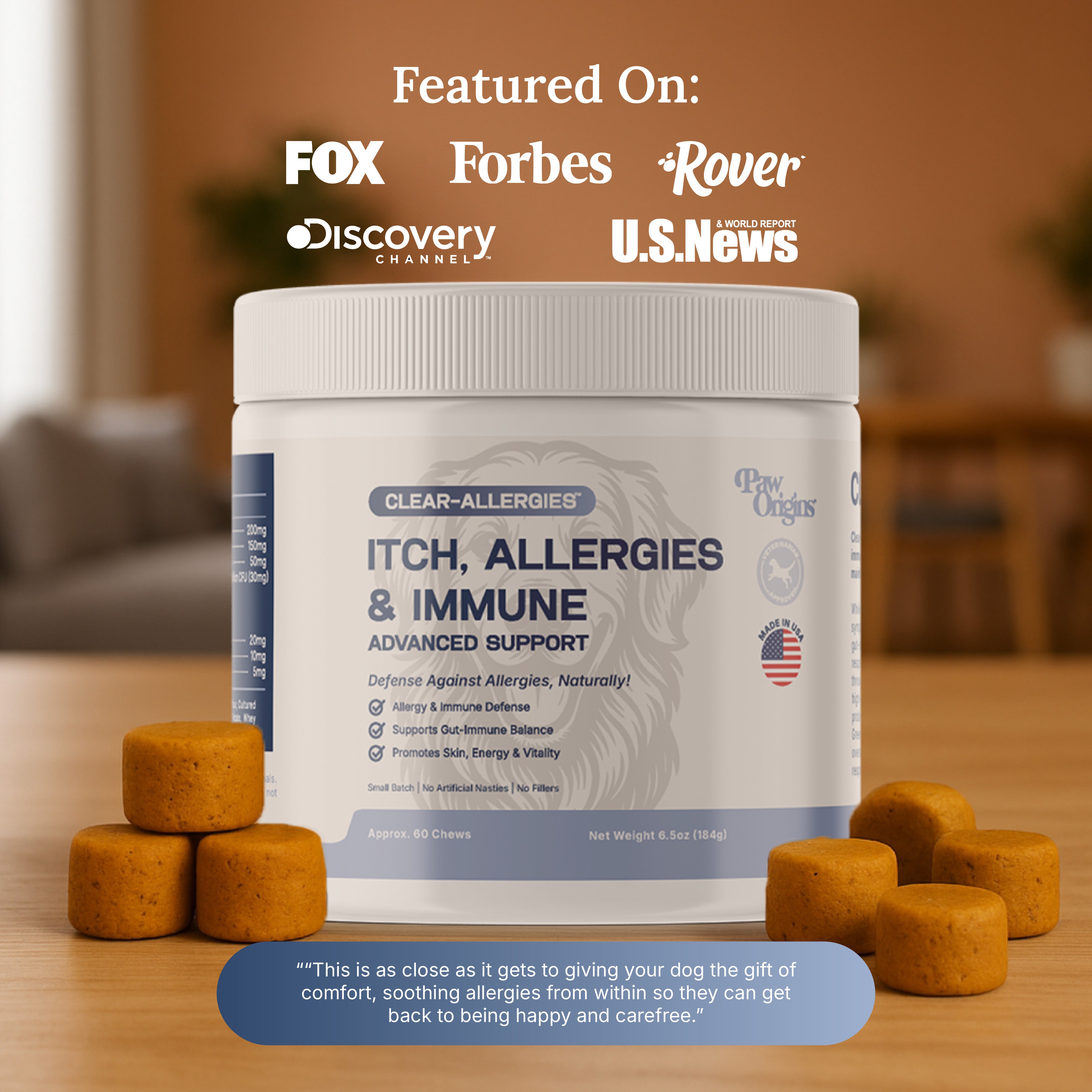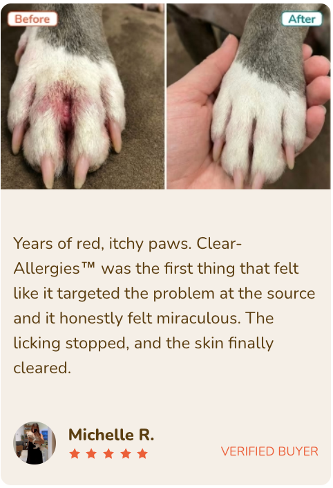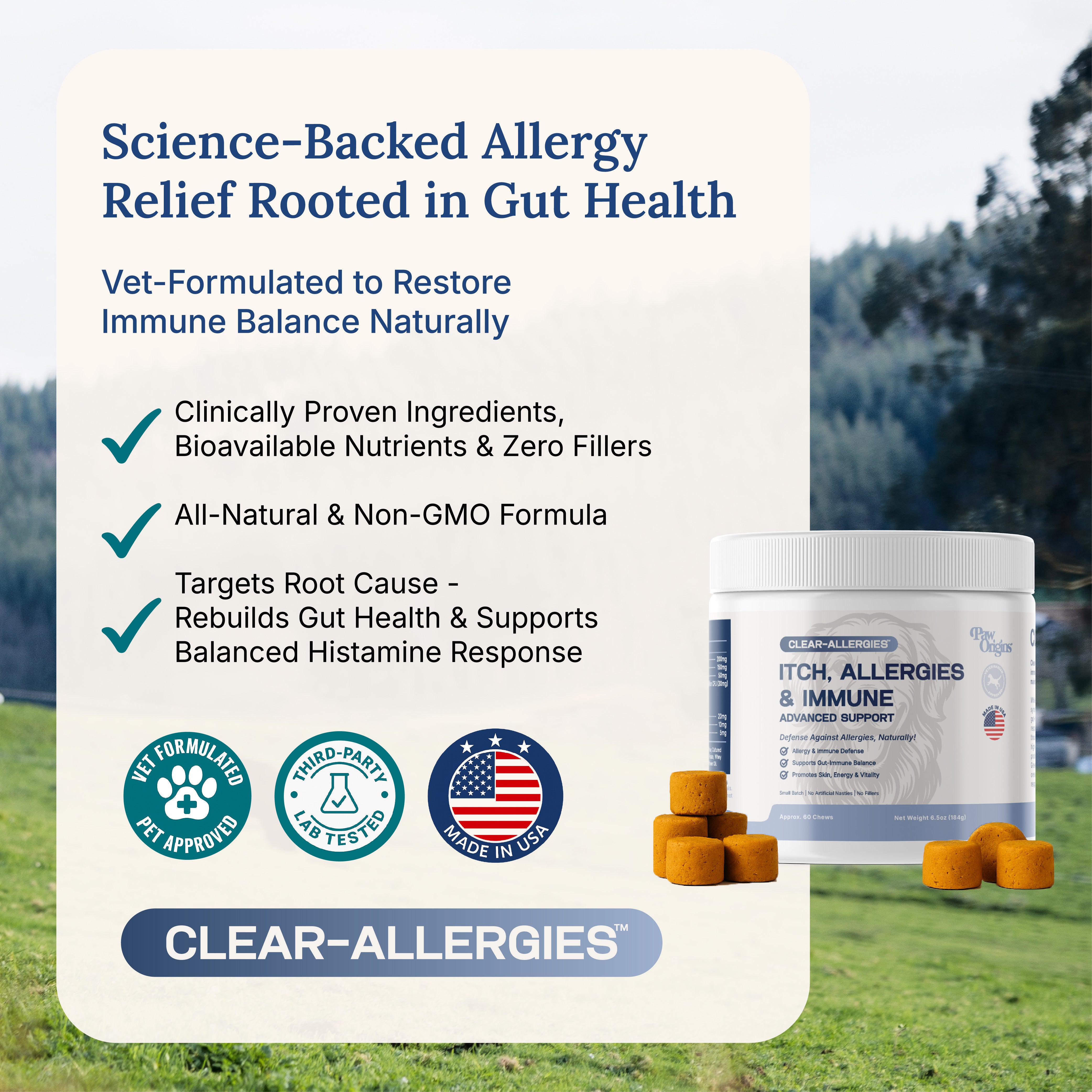 However, the real issue isn't the allergen itself—it's your dog's immune system overreacting to harmless substances due to gut-immune axis dysfunction. That's exactly what Clear-Allergies™ is designed to correct.
