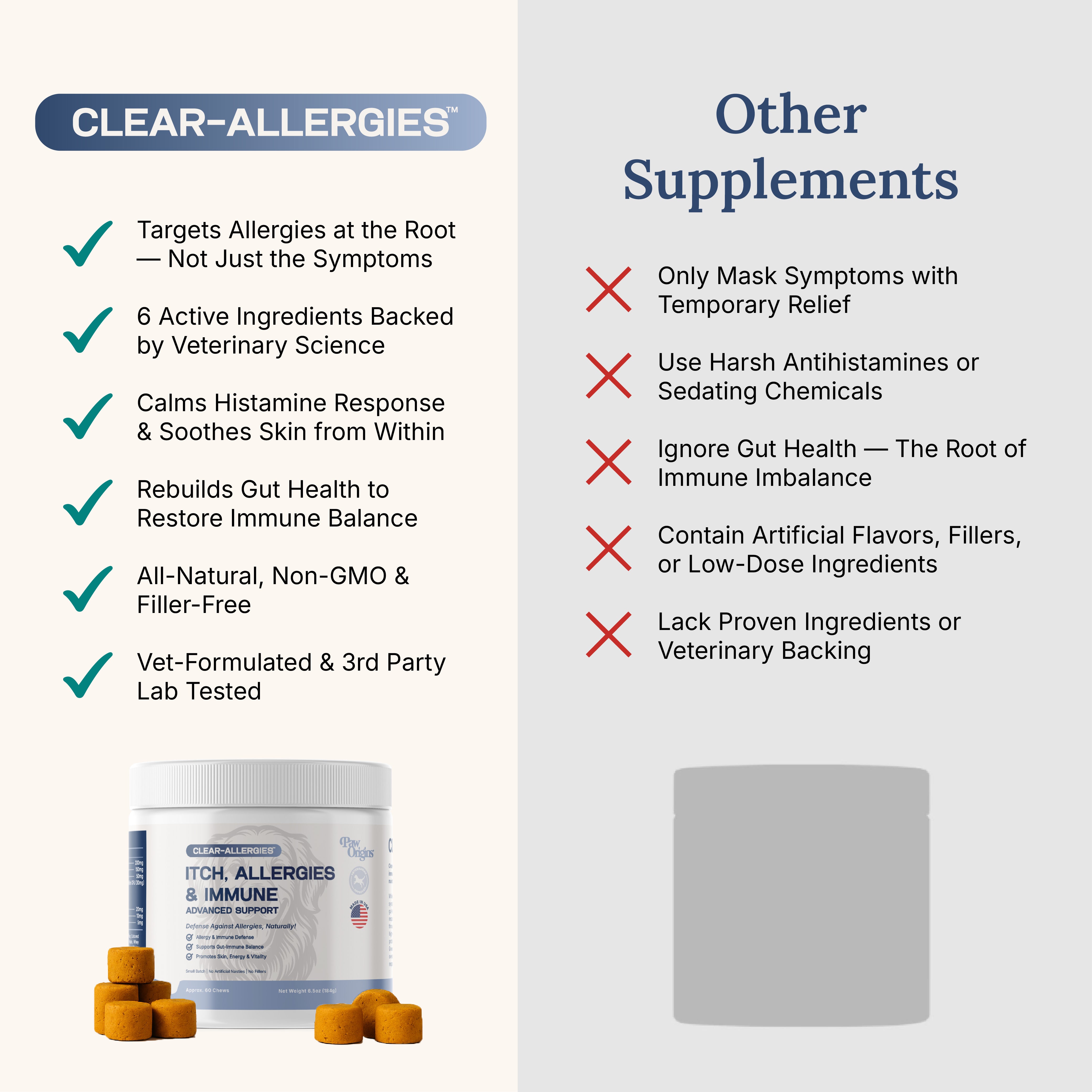 Clear-Allergies™ is different. Each ingredient is included at precise, therapeutic doses backed by clinical science. We target the gut, regulate IgE antibodies, stabilize mast cells, and calm histamine overload—interrupting the allergy cycle at every phase. That's why dog owners report dramatic improvements when other products have failed.