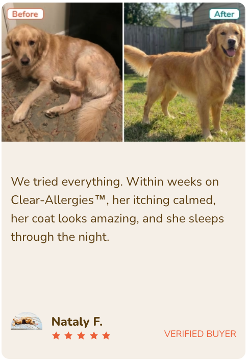 "My 7-year-old Golden Retriever Daisy has had environmental allergies since she was a puppy. She'd break out in hives, scratch herself raw, and develop ear infections. Over the years, I've easily spent $6,000+ on vet visits, steroids, and antibiotics. Last season, I tried Clear-Allergies, and within days her scratching reduced dramatically. We made it through spring without a single vet visit for the first time in years. Even her chronic yeasty smell disappeared, my vet was surprised at her checkup. One jar costs less than a single vet visit, and the best part, it's natural!