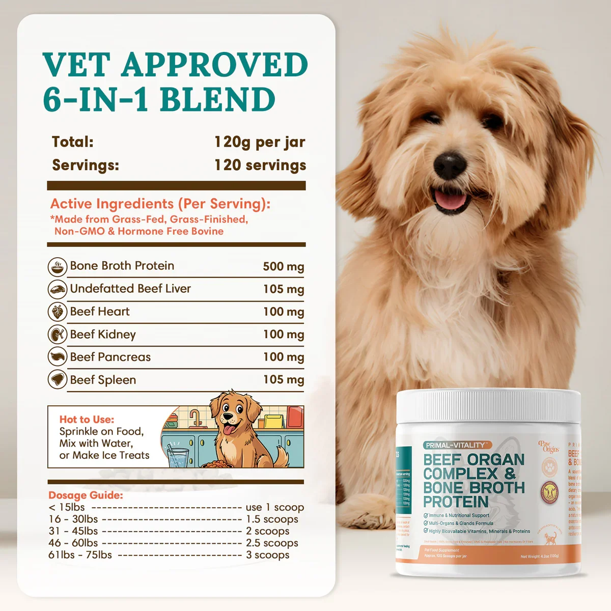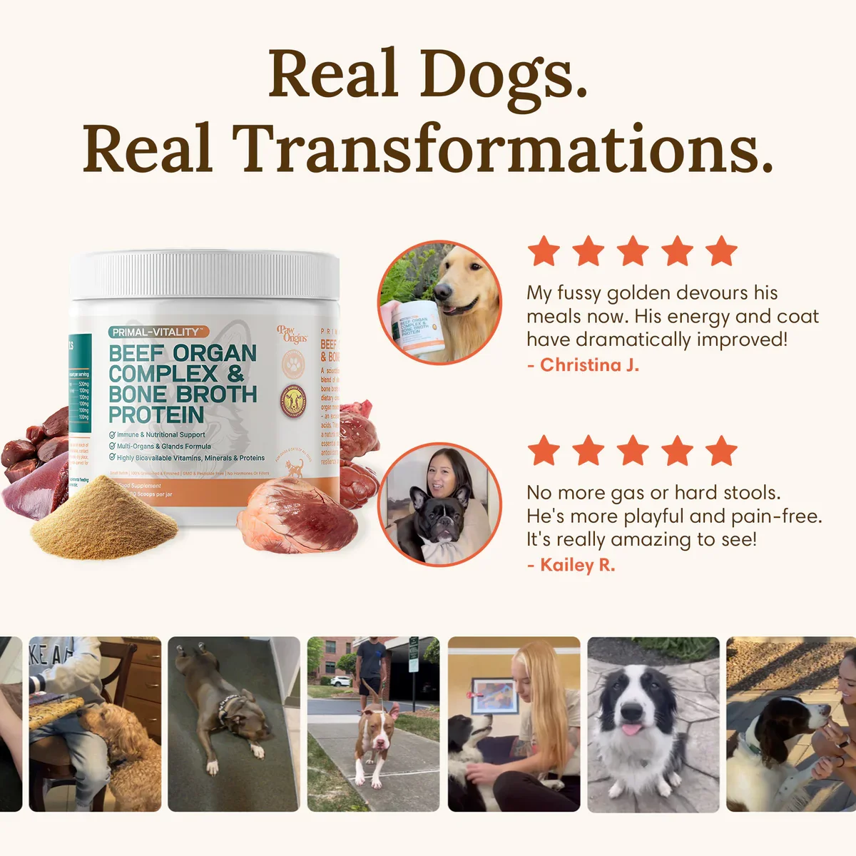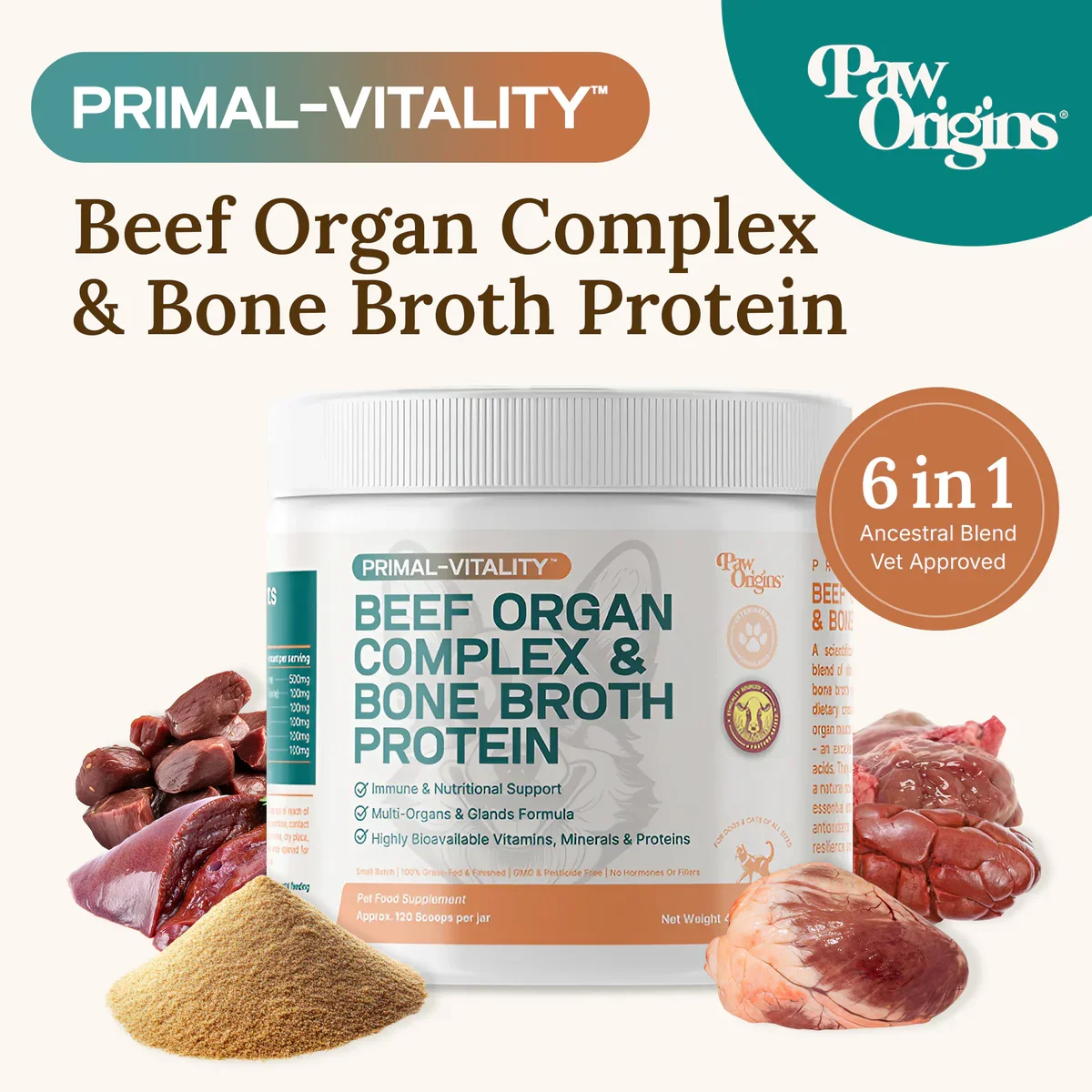 Primal-Vitality™ is a meticulously crafted, hydrolyzed, 6-in-1 blend of vital beef organs including undefatted liver, heart, kidney, pancreas, and spleen. Topped off with nutrient-rich bone broth protein. Mirroring the instinctive dietary choices of canine ancestors.
