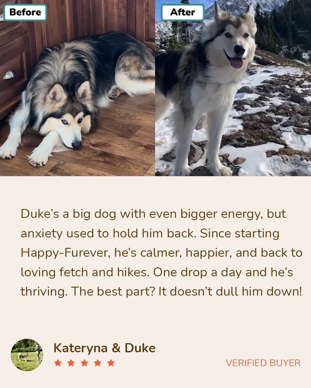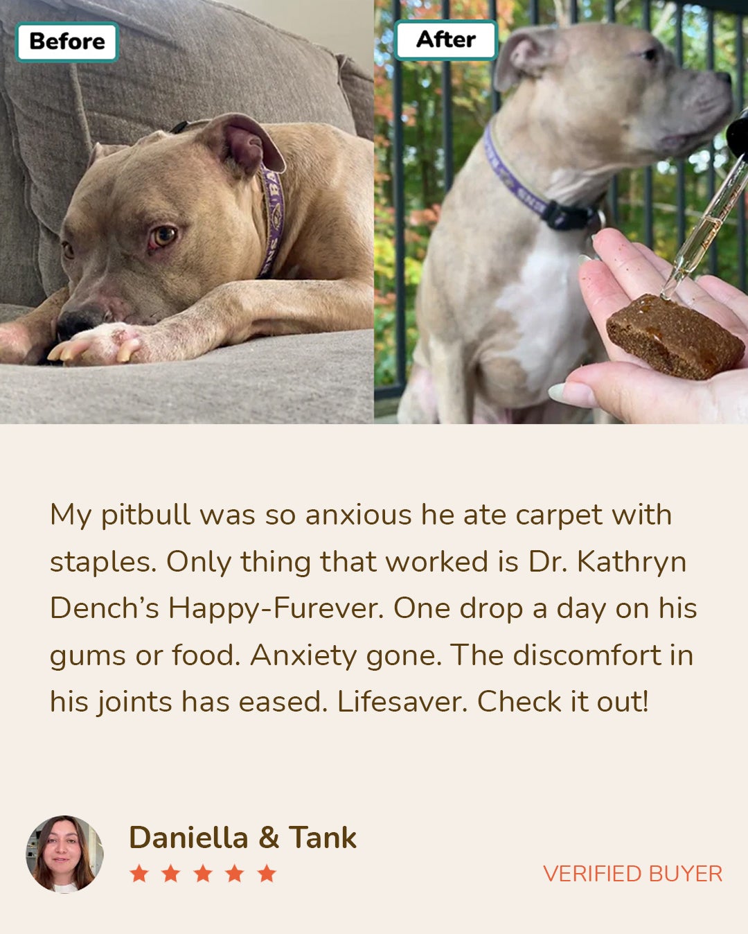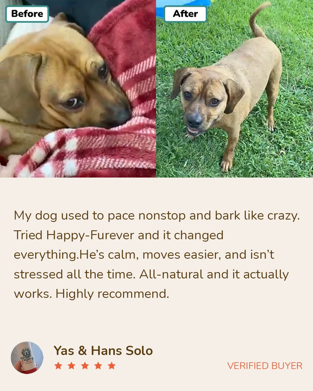 "Bought this for my senior dog who started showing signs of anxiety and pain after his hip surgery. It was heartbreaking to see him constantly whining and pacing around, being so uncomfortable. Some nights he would wake up from the pain, and would experience bouts of anxiety which made me really worried. Happy-Furever came in very timely because I knew how damaging medication can be and I really wanted something natural and gentle on my senior boy. It only took a couple of days for me to see results. My boy has so much energy right now, and even his limp got better!"