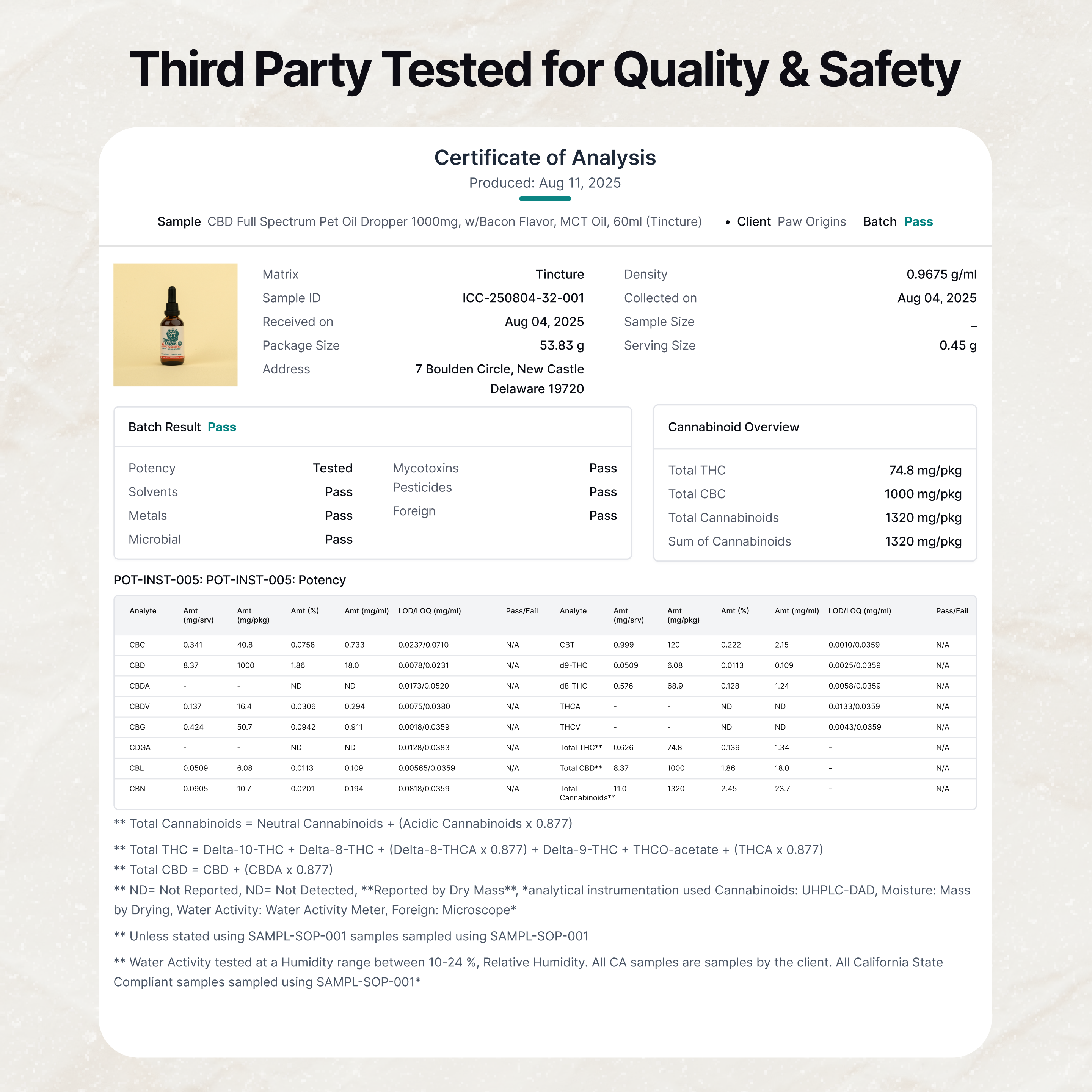 When testing, if a certain element is off on that batch, we throw away all of it and start over. After the product has been through the whole procedure, the testing is over and the product officially has a Certificate of Analysis (COA), which ensures the safety of your furry friends.