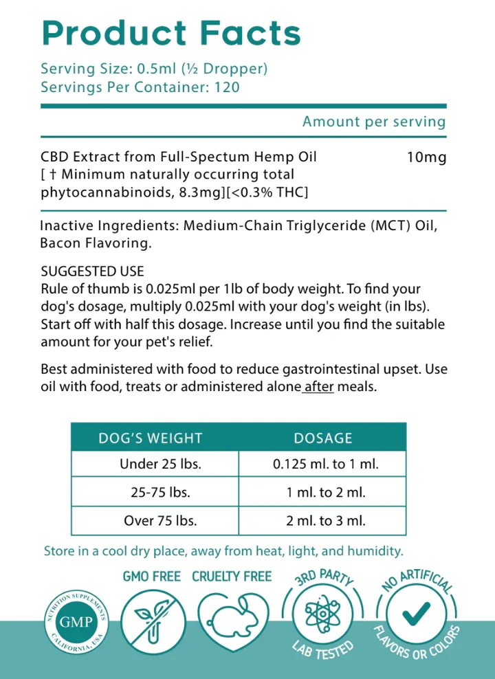 The rule of thumb for our bottles is to use 0.25ml per 10lbs of body weight, or 0.025ml per 1lbs of body weight. OR 0.5mg of CBD per 1lb of body weight.
